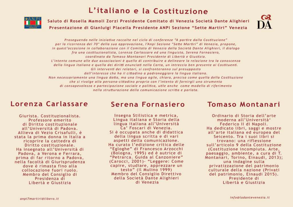Nel proseguire le iniziative raccolte nel ciclo di conferenze “A partire dalla Costituzione” per la ricorrenza del 70° della sua approvazione, l’Anpi Sezione “Sette Martiri” di Venezia, ha proposto, in tale occasione in collaborazione con il Comitato di Venezia della Società Dante Alighieri, il dialogo fra un linguista ed un costituzionalista dal titolo “L’italiano e la Costituzione”.